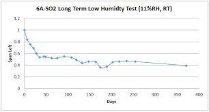 The effect of low humidity on SO2 sensors is significant. For example, the chart below shows the results of continuously exposing an SO2 sensor to 11%RH. The span drops over 50% in a month until it reaches equilibrium at that low humidity level. The sensor has 50% span remaining after about two months.